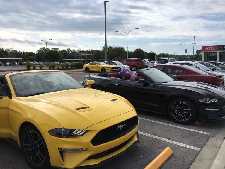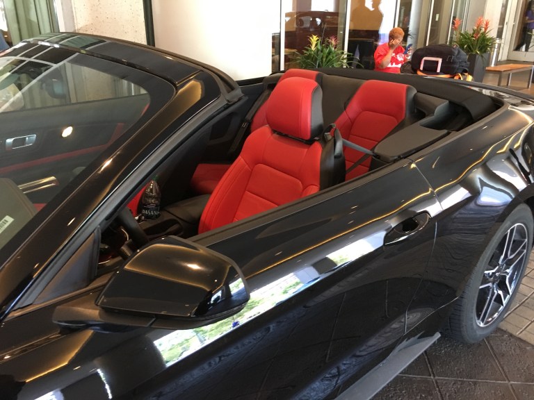 I noen dager nå har bilen signalisert at den trenger et oljeskift, og da statusen i dag endret seg fra “oil change recommended” til “oil change required” tenkte vi det var best å svinge innom et av kontorene og høre hvor mye dette hastet. De ville gjerne at det ble gjort før vi kjørte videre, men de hadde ingen på jobb på verkstedet siden det var søndag. De hadde en Mustang kabriolet inne, og tilbød oss å bytte bil. Og selv om vi hadde blitt glade i den gule bilen, var den nye også ganske kul: svart med røde seter☺️