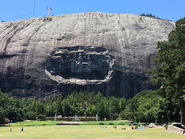 Stone Mountain med utskjæringen foran, som er større enn selveste Mount Rushmore.