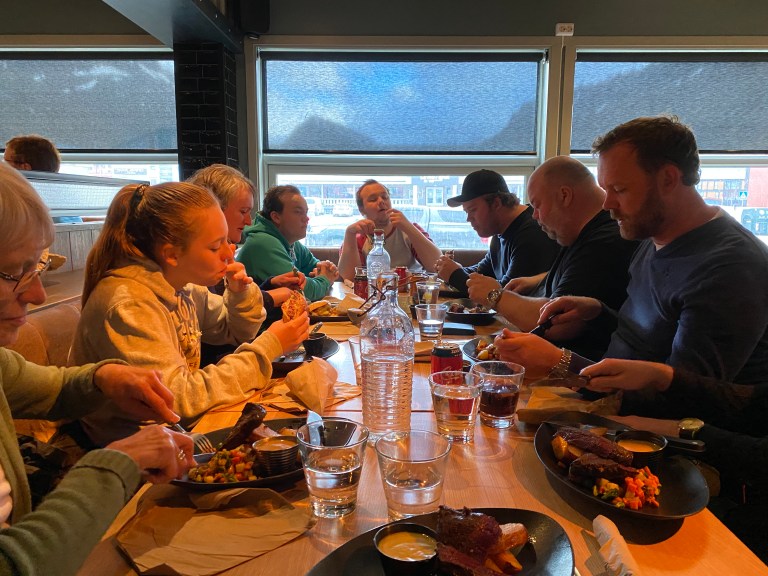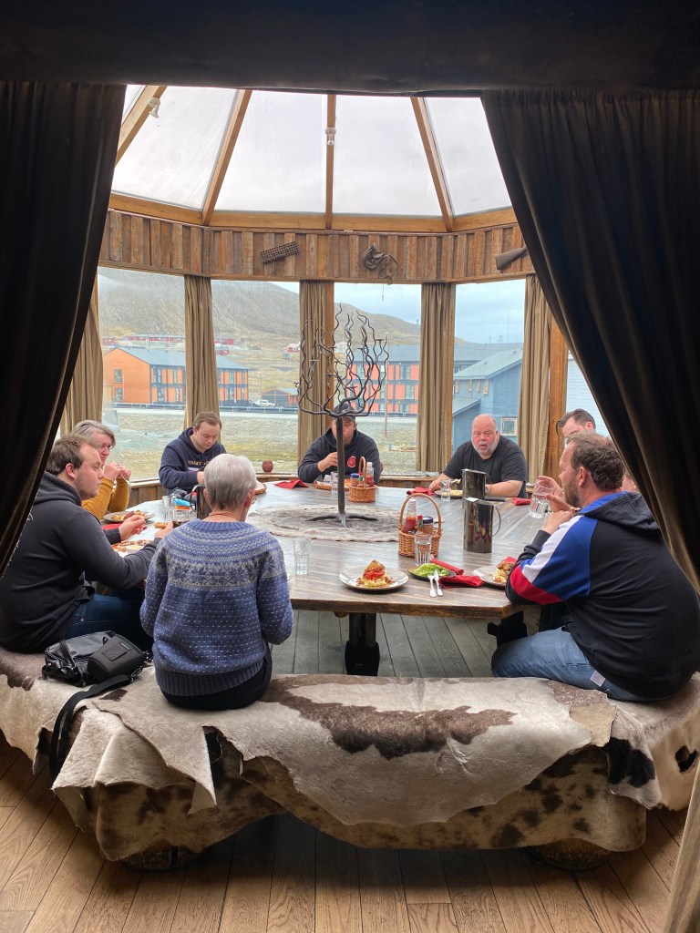 Fra Pyramiden gikk vi ombord på båten igjen, og etter tre timers båttur kom vi tilbake til Longyearbyen. Da vi gikk vi for å spise middag på Stationen.