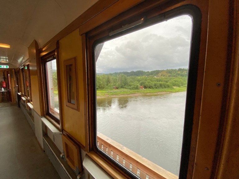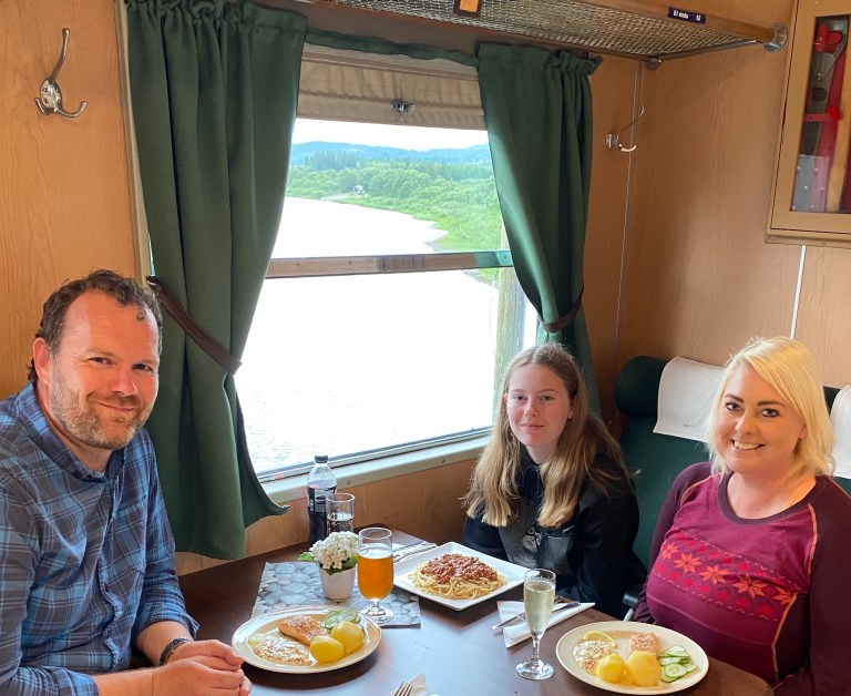 Laks fanget i elva under oss var kveldens middag😋Det ble etterhvert god stemning i restaurantvognen, og trønderske uttrykk som blant annet “toillkall” hørtes jevnlig☺️