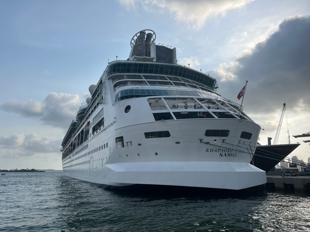Klokka fire kunne vi sjekke inn på cruiset, og vi tok en taxi til cruisekaia. Der stod skipet klart, Rhapsody of the Seas!