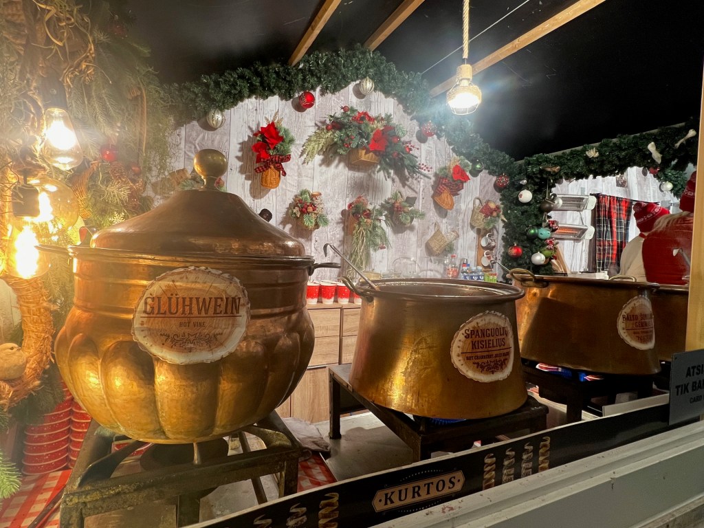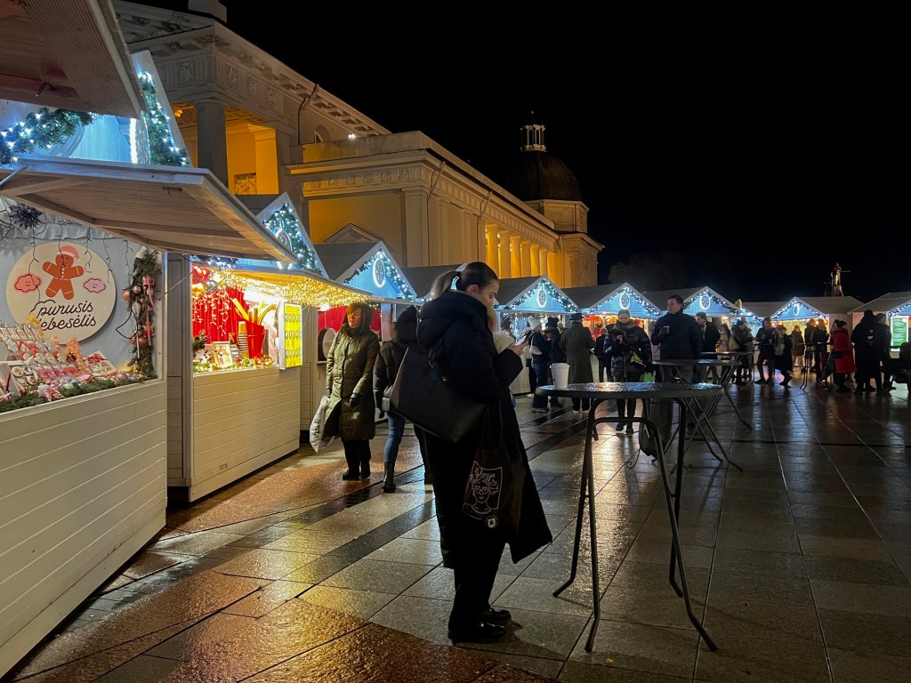 This market features charming wooden stalls offering a variety of handcrafted goods, such as ornaments, jewelry, candles, and knitted winter accessories. It’s an ideal place to pick up unique gifts and souvenirs. The food stalls are equally tempting, with Lithuanian holiday specialties like kūčiukai (small sweet pastries), šakotis (a layered tree cake), and mulled wine to warm you up on chilly evenings.
