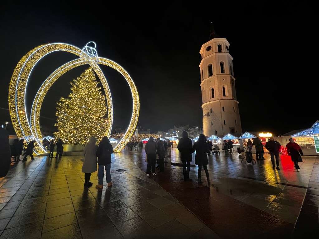 The heart of Vilnius’ Christmas celebration is the market at Cathedral Square, set against the backdrop of the iconic Vilnius Cathedral and its grand bell tower. The centerpiece is the massive Christmas tree, beautifully decorated with lights and ornaments, often designed to reflect Lithuanian traditions or modern artistic concepts.